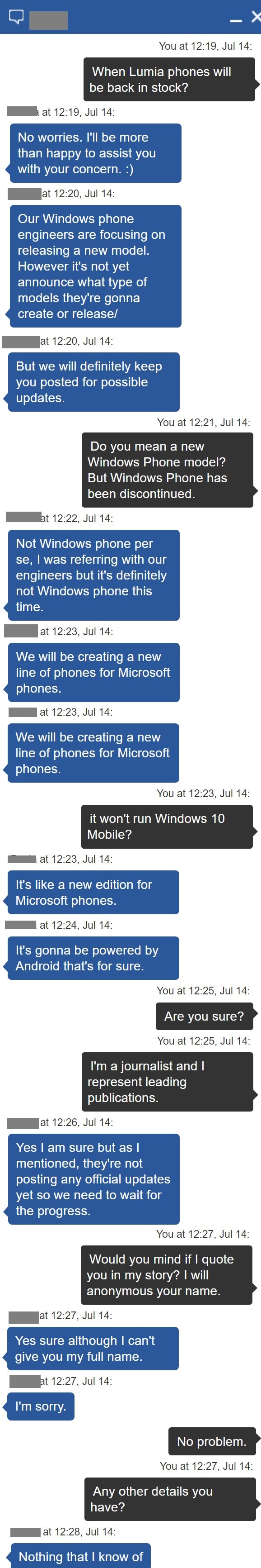 No obstante, recientemente se filtró información en el portal de Windows Latest , en la que supuestamente un empleado de la Microsoft Store , mediante atención vía Chat , confirmó a un cliente que “una nueva línea de teléfonos ” que “seguramente” será “ impulsada por android ” estará muy pronto a la venta, mientras respondía a una pregunta sobre la disponibilidad de los equipos Lumia.