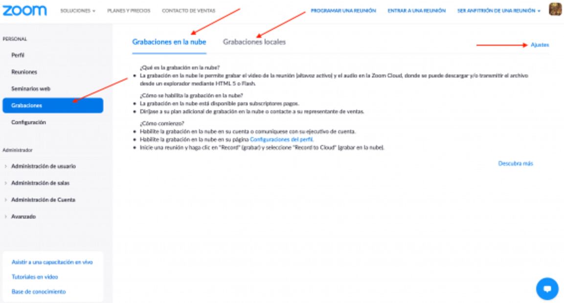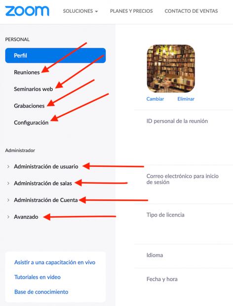 Si deseas modificar otras funciones , debes acceder al menú que aparece en la parte superior izquierda, el cual te permite modificar tus reuniones , seminarios web , grabaciones y tu configuración , así como administrar todo lo relacionado con tu cuenta y reuniones.