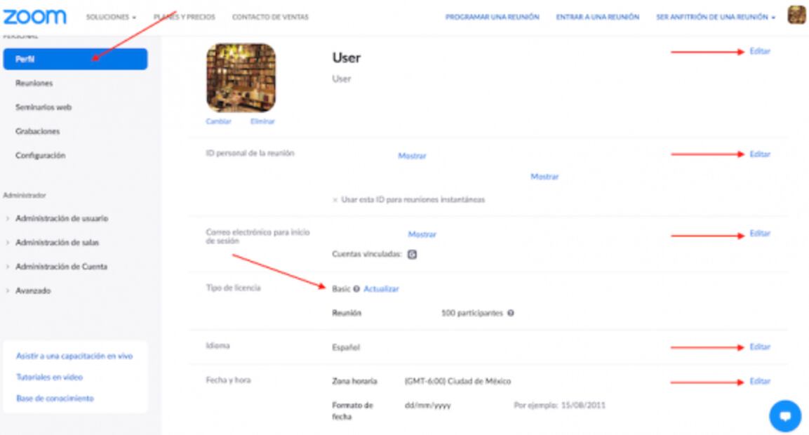 2. La opción para editar tu nombre , ID personal , tipo de cuenta , idioma , fecha y hora se encuentra a la derecha.