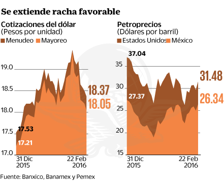 El dólar cedió terreno al peso derivado de la continua recuperación de los petroprecios y al pinchazo a la burbuja cambiaria que dieron las autoridades mexicanas la semana pasada.
