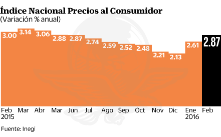 En el segundo mes del año, el Índice Nacional de Precios al Consumidor registró un incremento mensual de 0.44%, con lo que el alza anual ascendió a 2.87%, la tasa más alta desde junio de 2015.