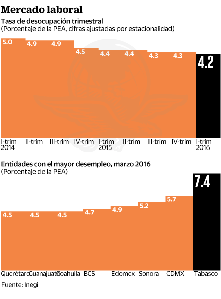 Entre las entidades que reportaron las mayores tasas de desocupación en marzo, destacó Tabasco, con tasa de 7.4%, producto de la crisis que enfrenta la industria petrolera en la región.