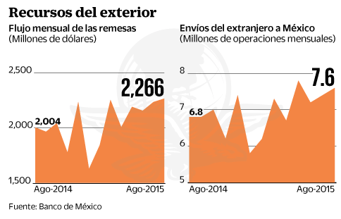 En agosto pasado los envíos de dinero de los mexicanos que trabajan en el exterior sumaron 2 mil 266.41 millones de dólares, monto 13.08% superior al registrado en el mismo mes de 2014, informó el Banco de México (Banxico).