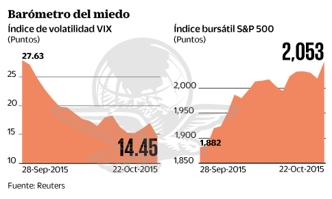 El índice VIX, que mide la volatilidad en los mercados de Estados Unidos, registró una baja de 13.5%, la más pronunciada desde el 2 de septiembre, para terminar en 14.45 puntos y significó su menor nivel desde el 18 de agosto.