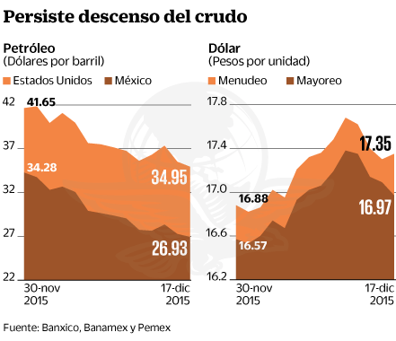 Las cotizaciones internacionales del petróleo prolongaron las pérdidas generalizadas. Tan sólo en dos días, el valor del barril de crudo mexicano se ha desplomado 5% para acabar en 26.93 dólares por barril, su menor registro desde diciembre de 2004.