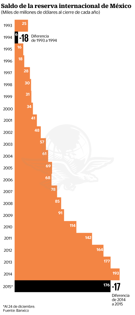 Las reservas internacionales registraron un saldo de 176 mil 353 millones de dólares a sólo una semana de que termine este año, lo que significa un desplome de 16 mil 886 millones con relación al cierre de 2014, el más severo desde 1994, de acuerdo con información divulgada por el Banco de México (Banxico).