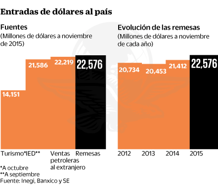 De enero a noviembre de 2015, las remesas de mexicanos, sobre todo desde EU, crecieron 5.4% comparadas con igual periodo de 2015, para acumular 22 mil 576 millones de dólares, informó Banxico.