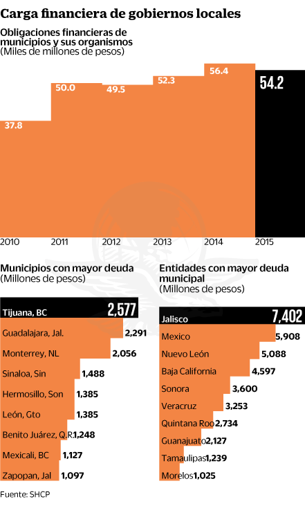 Entre dichas localidades, las que alcanzan mayores montos son Tijuana, Baja California, con obligaciones por 2 mil 577 millones de pesos; seguida por Guadalajara, Jalisco, con 2 mil 291 mdp; y Monterrey, Nuevo León, con 2 mil 56 millones de pesos.