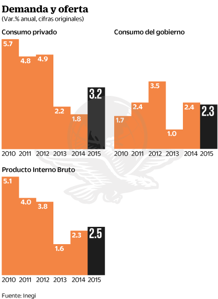 Al dar a conocer los resultados de la demanda y la oferta globales de bienes y servicios al cierre de 2015, el Inegi informó que el consumo privado reportó un incremento para todo el año de 3.2%, con base en cifras originales, por lo que su contribución a 2.5% de crecimiento del PIB el año pasado fue de 2.1 puntos porcentuales.