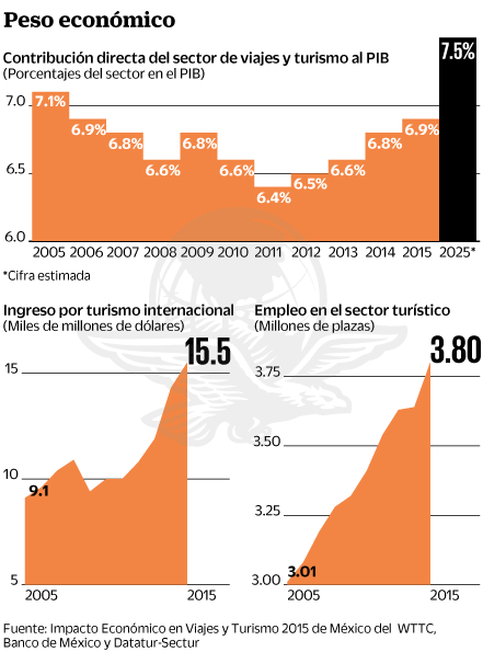 Según cifras del consejo, la contribución directa del sector al PIB en 2014 fue de mil 155 millones de pesos (6.8% del PIB) y en 2015 fue de mil 226 millones de pesos (6.2%).
