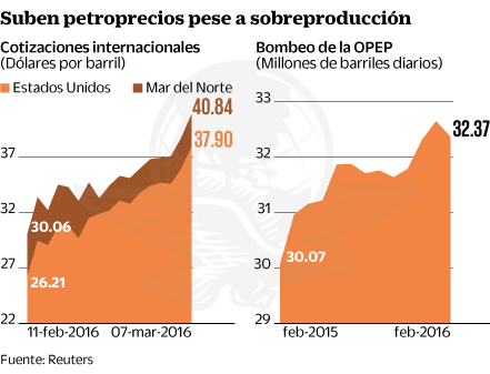 El crudo extraído del Mar del Norte (Brent) se vendió en más de 40 dólares por primera vez desde el 9 de diciembre, mientras que el petróleo estadounidense en 37.90 unidades, su mejor cotización desde el 24 de diciembre.