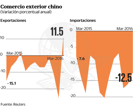 Las exportaciones chinas crecieron 11.5% anual en marzo frente al aumento previsto de 2.5%, al mismo tiempo que las importaciones disminuyeron 7.6% contra el desplome esperado por analistas de 10.2%.
