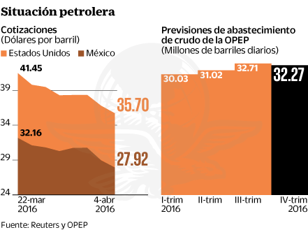 El barril de crudo estadounidense cayó 3% para finalizar en 35.70 dólares, mientras que el hidrocarburo mexicano descendió 3.6% a 27.92 unidades, para ambos tipos de crudo significó su nivel más bajo desde el 3 de marzo.