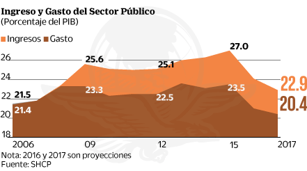Las cifras oficiales estiman una caída en el total de ingresos de 2.5 puntos porcentuales del PIB en 2016, lo cual, en principio, implica una reducción en el gasto de gobierno de 2.9 puntos porcentuales para mantener el objetivo de déficit.