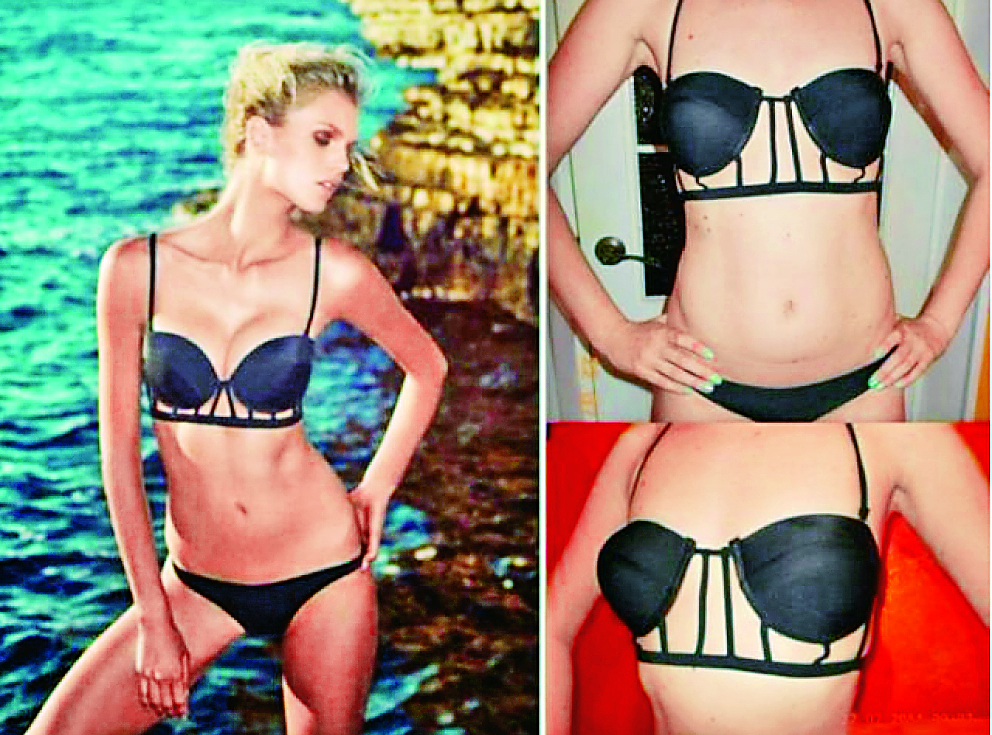 Quizá una de las cosas más sencillas de comprar en Internet sea un traje de baño ¿son de lycra, no? ¿qué tanto puede salir mal? Pues por pensar lo mismo, esta chica se llevó una —nada grata— sorpresita. Al ver la foto, la clienta web, que innegablemente tiene una figura muy adecuada para lucir un breve bikini, se imaginó paseando por la playa en este sexy numerito negro. Acto seguido, lo ordenó para recibir este —literal— bodrio mal cosido (y también mal cocido). Las copas son totalmente distintas a las del diseño original, y las tiras que lo hacían “diferente” son de un largo exagerado que las fruncen y hacen lucir al top... realmente absurdo #niparatrapo