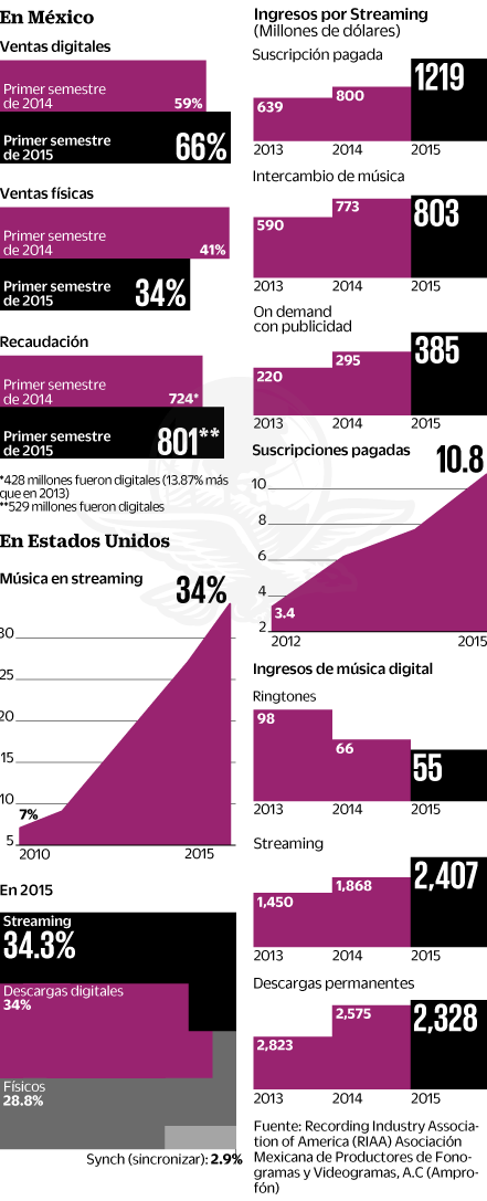 Esto significa que si en 2014 solamente el streaming se apoderó de mil 868 millones de dólares, para el año pasado la cifra aumentaría hasta los 2 mil 407 millones (1219 millones con suscripción pagada, 803 millones por intercambio y los últimos 385 millones con anuncios de publicidad).