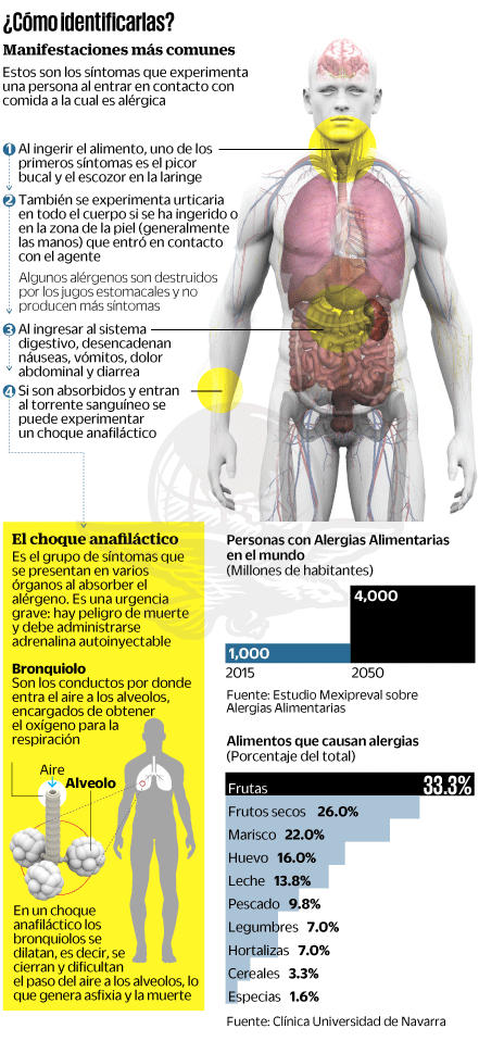 Tras ingerir alguno de esos alimentos la reacción alérgica puede manifestarse a través de síntomas cutáneos, respiratorios y gastrointestinales, como erupciones en la piel, mucosidad, obstrucción en las vías respiratorias, náuseas, vómito y diarrea, entre otros. En el peor de los casos el paciente experimenta una reacción anafiláctica o alérgica que puede ser mortal.