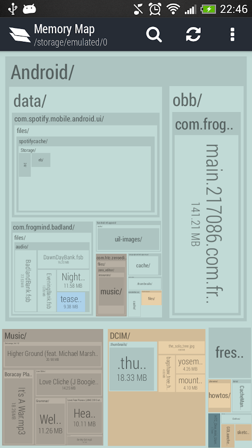 Una buena herramienta para saber excactamente que está ocupando espacio en tu memoria es “Memory Map”. Esta aplicación brinda una perspectiva más clara de qué está ocupando más espacio en la memoria interna de Android. Su interfaz es clara y fácil de utilizar, ya que muestra las carpetas y archivos en forma de cuadriláteros, mostrándo una relación de tamaño por cada área de archivos: mientras mayor es su tamaño geométrico, más espacio ocupan en la memoria.