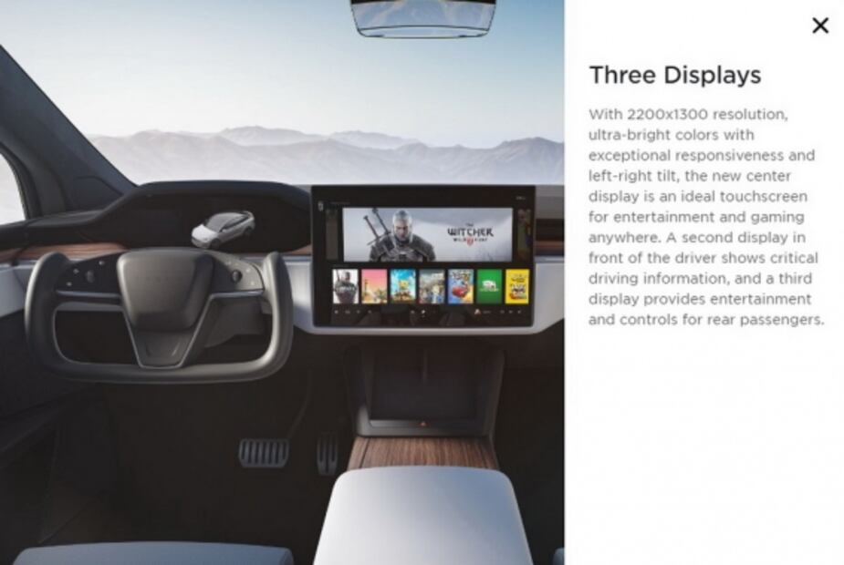 también dice que las dos nuevas pantallas centrales de los vehículos actualizados cuentan con una computadora para juegos con "hasta 10 teraflops" de potencia de procesamiento, que es aproximadamente lo mismo que las consolas de juegos de última generación, lo que les permite ejecutar juegos como " The Witcher 3 " y " Cyberpunk ", además de los juegos de arcade ya disponibles a través de un controlador inalámbrico.