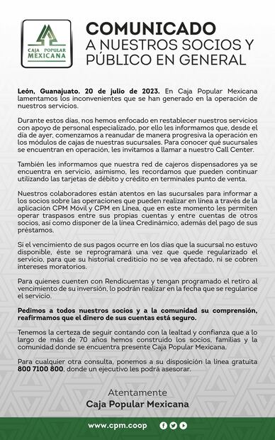 COMUNICADO A NUESTROS SOCIOS Y PÚBLICO EN GENERAL: CAJA POPULAR MEXICANA