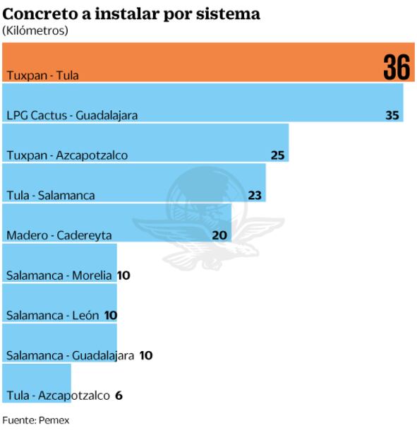 En el ducto Tuxpan-Tula, de 306 kilómetros, se colocará concreto en 36; en el LPG Cactus-Guadalajara, de mil 104 kilómetros, se blindarán 35; en el Tuxpan-Azcapotzalco, de 314 kilómetros, serán 25; en el Tula-Salamanca, de 223 kilómetros, blindarán 23, y el de Madero-Cadereyta, de 492 kilómetros, otros 20.