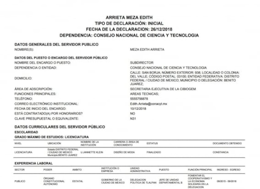 El pasado viernes, EL UNIVERSAL publicó que el nuevo subdirector y coordinador de comunicación e información estratégica del Conacyt, David Alexir Ledesma , percibe un salario de 44 mil pesos mensuales según su clave presupuestal “N31” que declaró ante la Función Pública. Edith Arrieta Meza está registrada bajo la misma clave presupuestal y también como subdirectora, pero en la plataforma Declaranet no hizo público sus ingresos.
