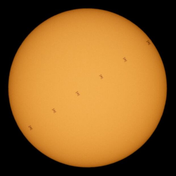 Una vez más, una de las fotografías de Joel Kowsky causó revuelo. En esta ocasión, sorprendió esta imagen compuesta de seis cuadros, en la que muestra a la EEI. La imagen captura la silueta de cinco tripulantes a bordo, mientras el Sol transita a cinco millas por segundo, aproximadamente.