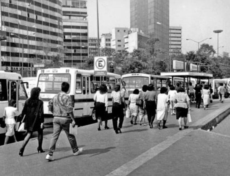 Así lucía el paradero cercano a la estación Hidalgo del Metro en 1991. Al fondo destaca la torre Prisma, ubicada en la esquina de la avenida Juárez.