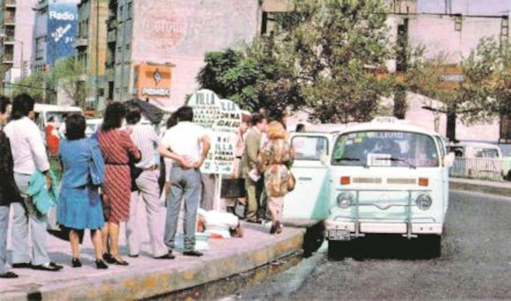 La fila para abordar una “combi-pesera” con dirección a La Villa en el paradero del Metro Chapultepec. A la derecha se ve la gasolinera que se ubica en la esquina de Chapultepec y Veracruz. Según la Secretaría de Movilidad de la Ciudad de México (Semovi), en 1968 surgieron los "peseros", que eran autos que prestaban servicio en ruta sin itinerario fijo y eran llamados así porque su tarifa era de un peso.