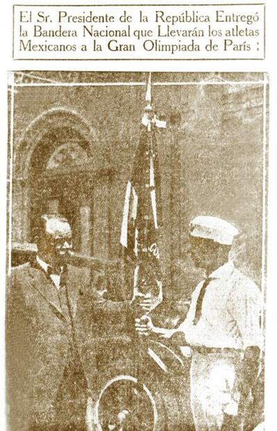 Obregón entrega la bandera a los atletas que compitieron en los Juegos Olímpicos de París 24, los primeros en los que México participó. El sonorense era un gran aficionado al beisbol.