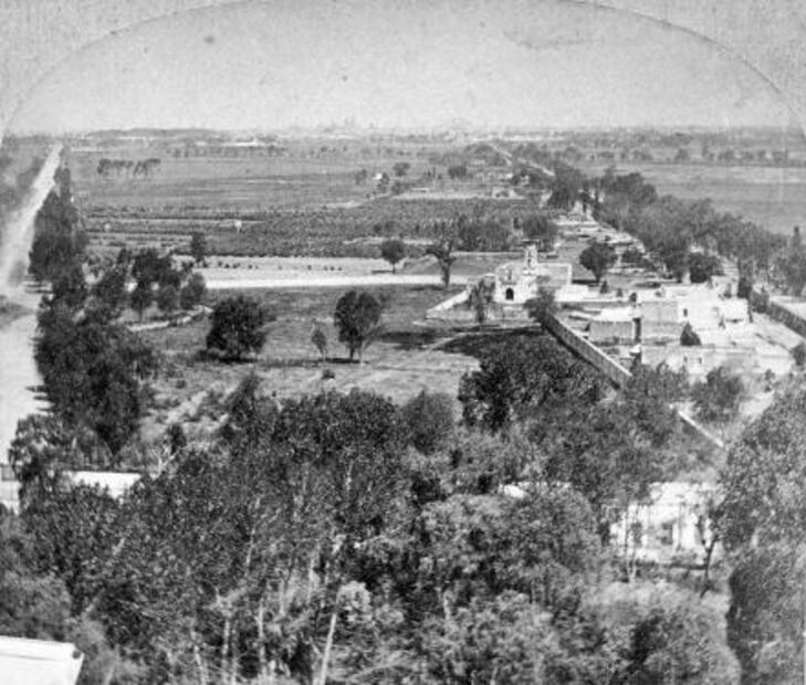 La vista desde lo alto del Castillo de Chapultepec hacia el oriente alrededor de 1873, antes de que se fraccionara la actual colonia Juárez. Del lado derecho está la Calzada de Chapultepec, y a la izquierda, el Paseo de la Reforma; destaca una capilla que fue conocida como San Miguel Chapultepec y que hoy ya no existe. Imagen: Col. Elmer and Diane Powell, Southern Methodist University.