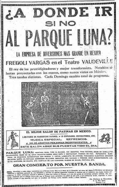 Publicidad del Parque Luna del año 1907. Se anunciaba “el mejor salón de patinar en México, 1,500 pares de magníficos patines, 16 empleados, instructores. Música especial, refrescos. Este salón abre sus puertas todo el día. No se admiten personas inconvenientes”, se lee en su contenido.
