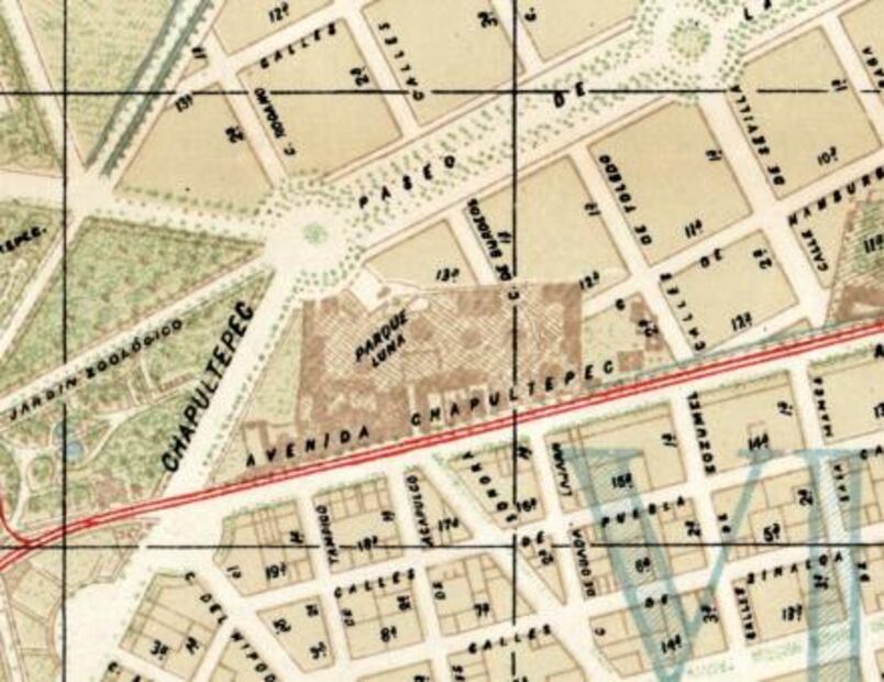 Mapa del año 1907 donde se indica el área que ocupaba el Parque Luna de Chapultepec.