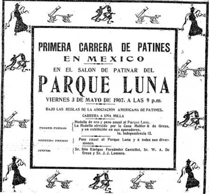 "Primera carrera de patines en México… Bajo las reglas de la Asociación Americana de Patines…carrera a una milla" indica esta publicidad del Parque Luna en 1907. El primer lugar se haría acreedor a una medalla de oro y a un pase anual a este parque. El segundo lugar sólo obtendría el pase anual al parque.