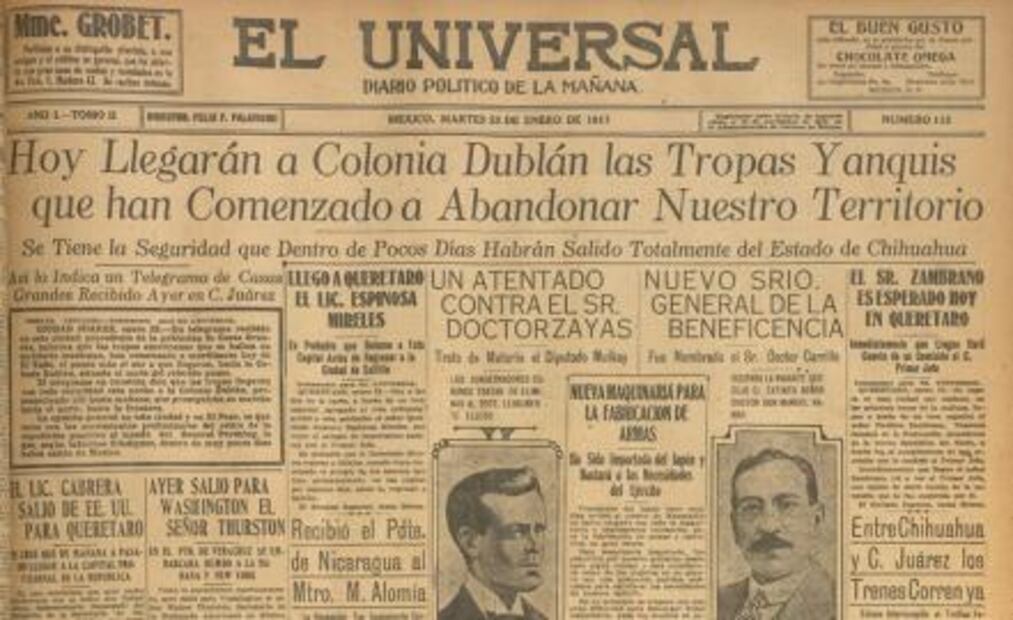 En la primera plana de EL UNIVERSAL, publicada el 23 de enero, se adelantaba que las tropas estadounidenses se concentrarían en Colonia Dublán, en Ciudad Juárez, Chihuahua, para de ahí retirarse hacia la Unión Americana.