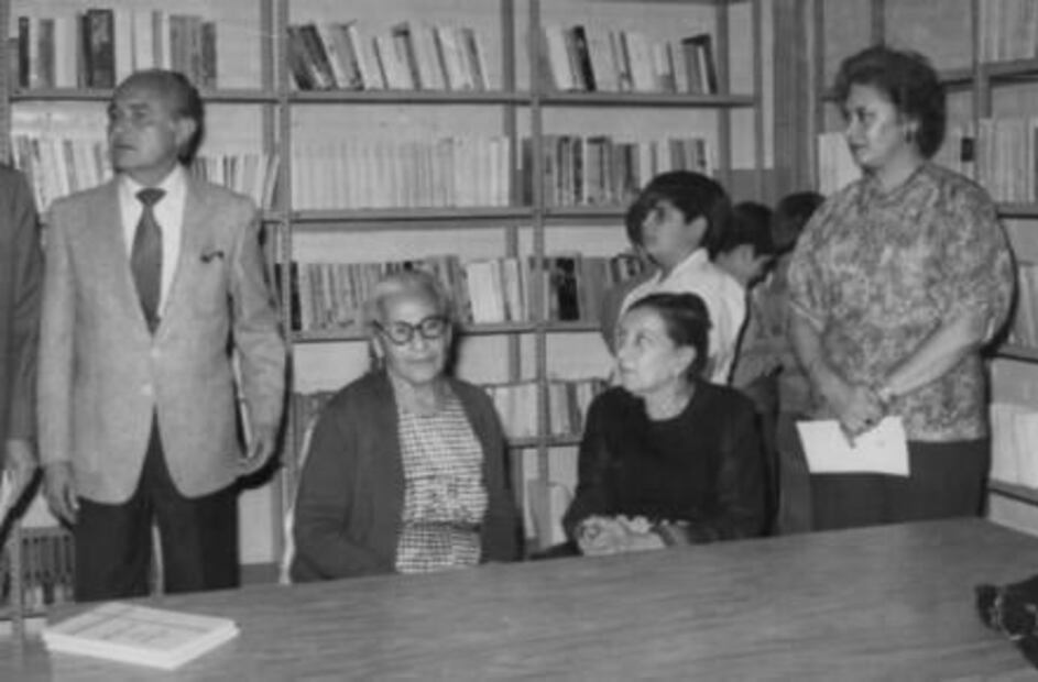 Benita Galeana acompaña a Magdalena Mondragón, durante la inauguración de la biblioteca que lleva el nombre de la periodista. Foto de los Hermanos Mayo.