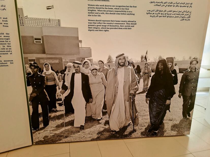 Si bien se trata de un museo independiente del gobierno, el recinto tiene un lazo estrecho con las autoridades del país, quienes no sólo asistieron a su inauguración sino que también hay una sala dedicada al jeque Zaye (el primer presidente del país) y su “empoderamiento” a las mujeres. En esta sala hay fotografías del jeque conviviendo con maestras, niñas y mujeres en el trabajo, así como una instalación con frases que dijo sobre la mujer, por ejemplo: “El rol de la mujer nunca es inferior al de un hombre y nuestras estudiantes de hoy son las madres de nuestro futuro” o “El Islam ha sacado a las mujeres de la oscuridad de la ignorancia, la humillación y la esclavitud. Le ha reconocido su carácter y le ha asegurado sus derechos a través de distintos dominios”.