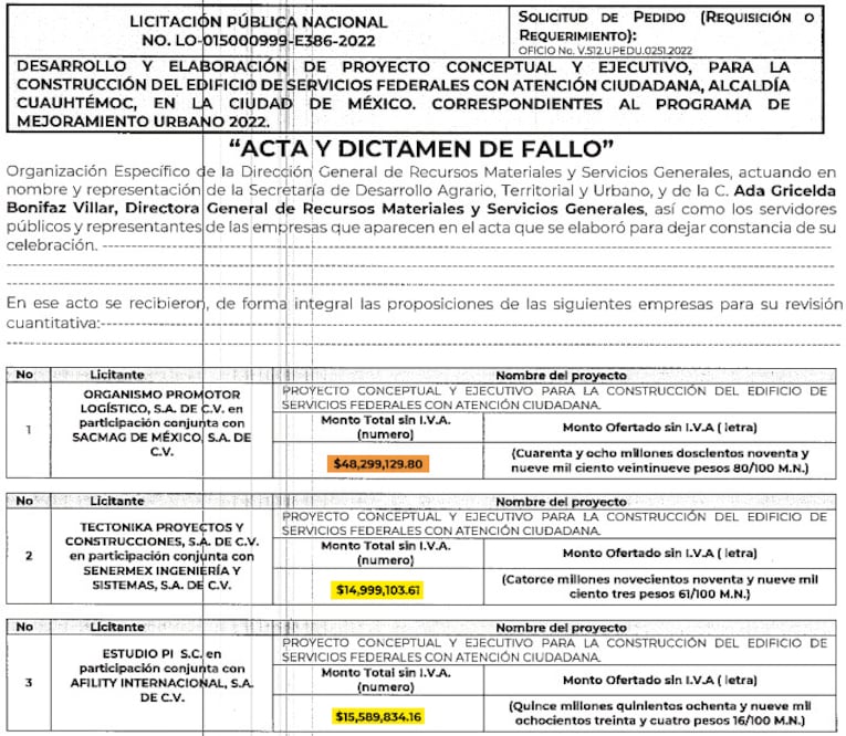 La Sedatu entregó una ficha informativa en la que explicó que desechó las propuestas tanto de Tectónika Proyectos y construcciones como de Estudio PI por incumplir los requisitos de la convocatoria y por no contar con la capacidad y experiencia técnica requerida.