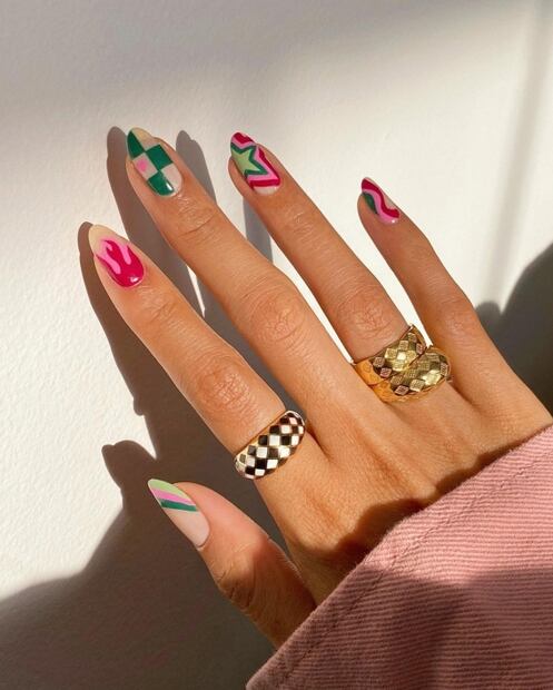 Por eso, la nueva tendencia beauty es no elegir entre un solo dibujo sino apostar por todos a la vez. El llamado pic and mix que ha enamorado a expertas en moda se traslada de las prendas a nuestras manos con una tendencia muy divertida que consiste en mezclar diferentes estampados y colores en la misma manicura.
