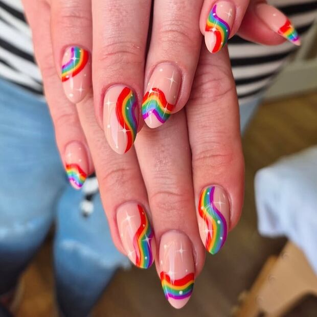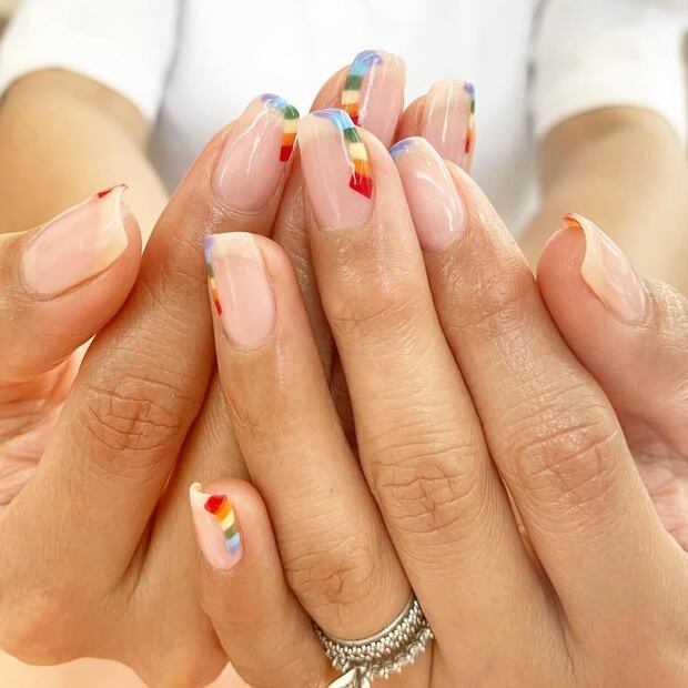 Uno de los más representativos del mes, consiste en crear una bandera arcoíris continuo que recorra todas las uñas, como si cada una fuera una franja del estandarte LGBTQ+. La base se deja en tono nude o transparente, lo que permite destacar los colores y añadir pequeños destellos o glitter para un acabado glam.