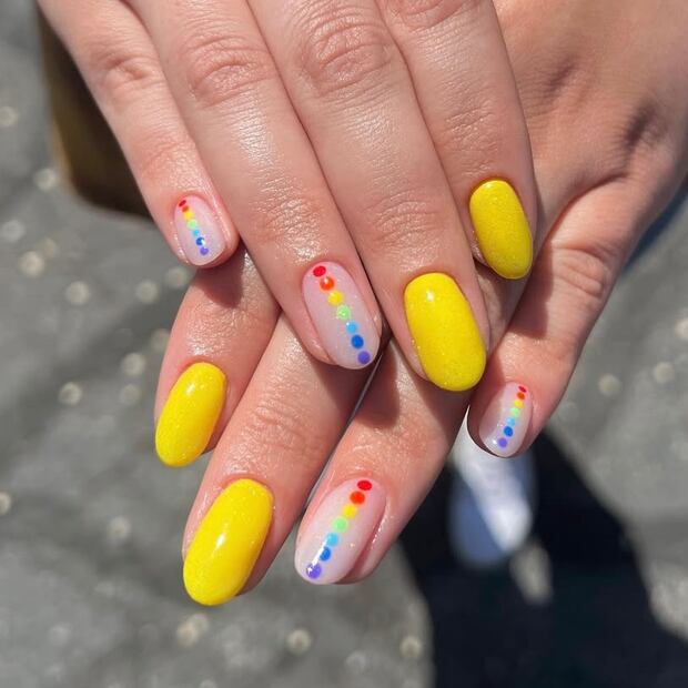 Una alternativa minimalista pero con personalidad, se alternan uñas completamente esmaltadas con los colores del arcoíris y otras con líneas de puntos en vertical. Estos puntos pueden estar colocados en el centro o en un lateral, generando un patrón ordenado y visualmente armonioso.
