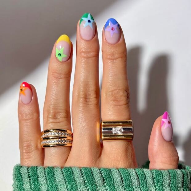 En este diseño se realiza un french manicure colorido, donde cada uña lleva una punta diferente en los colores de la bandera Pride, y sobre esa base se pintan estrellas en tonos que contrastan o hacen match. Es una propuesta alegre, festiva y muy veraniega.