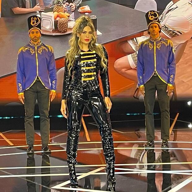 La conductora de 50 años de edad ha sorprendido a la audiencia al mostrarse en un traje de látex que da la ilusión de ser una soldadita. Pues podemos apreciar que todo su look es de color negro con unas líneas doradas que asemejen mucho a la vestimenta de los cascanueces. Este atuendo lo completó con unas botas de tacón alto en color negro brillante.
