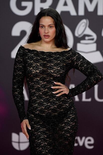 La cantante Rosalía deslumbró en la alfombra roja con un vestido largo semitransparente en color negro, de la firma Balenciaga, con encaje floral y escote barco.