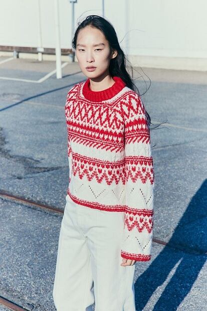 Las mujeres más clásicas que no desean lucir un suéter lleno de arbolitos o gorritos de Santa pueden elegir un ugly sweater con patrones sofisticados como este. Solo nos atrevemos a sugerir que sea rojo, no solo porque es el color de la temporada navideña, sino también porque es el tono triunfante del invierno 2023. Dónde: H&M. Precio: $629 pesos.