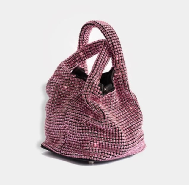 Para complementar su look , llevó un bolso de mano en forma de cubo, también con brillitos, de la marca vegana Giarité. El modelo se llama “Brilly”, en tono rosa. En la web de la firma especifican que está hecho a mano con cristales de alta calidad y posee una correa de cadena plateada desmontable, para adaptar su uso.