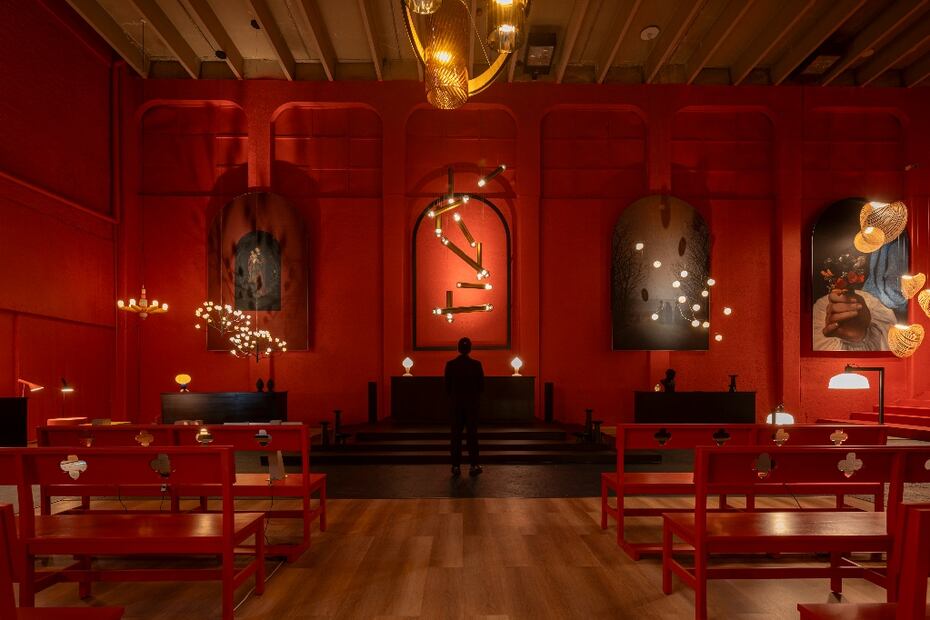 La ambientación del espacio tiene algunos altares en negro, pisos de madera y paredes pintadas con el color del año, según Comex: Vibrante.