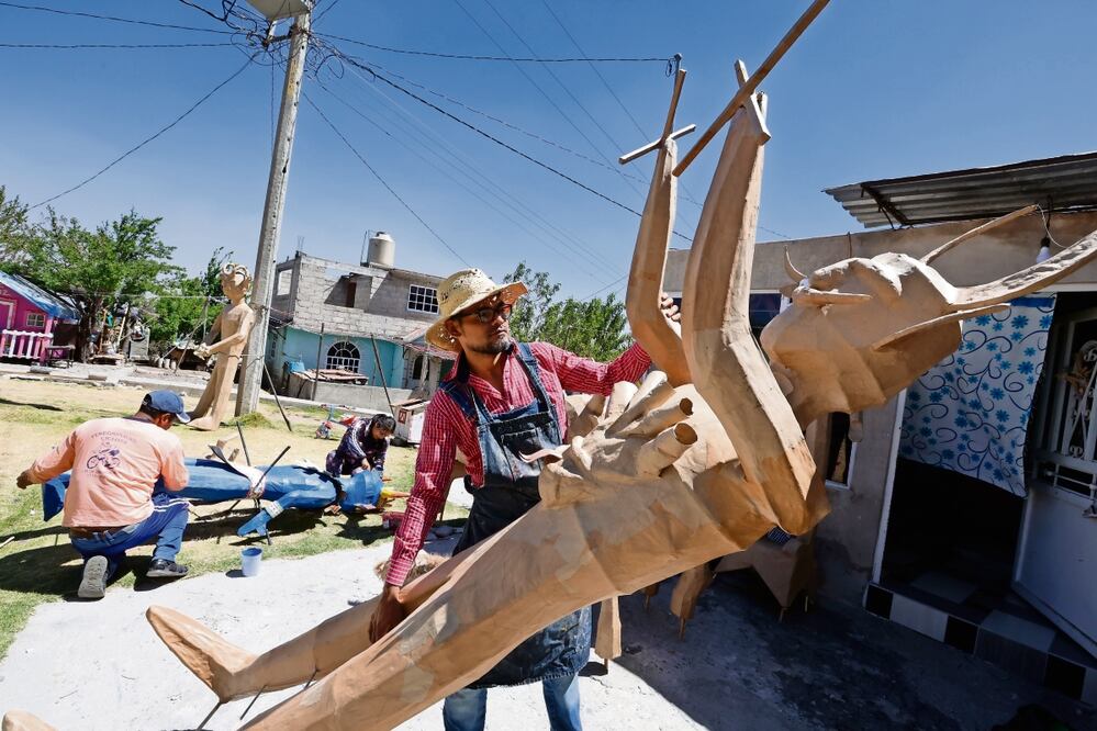 Almoloya de Juárez, Méx.— Pablo Emanuel Salazar prepara una pieza de 2.70 metros de altura hecha con cartón, carrizo y pólvora con la que van a participar en el concurso de Judas este año y que tiene como temática la escasez del agua y la manipulación por parte de las empresas sobre el consumo desmedido del líquido.