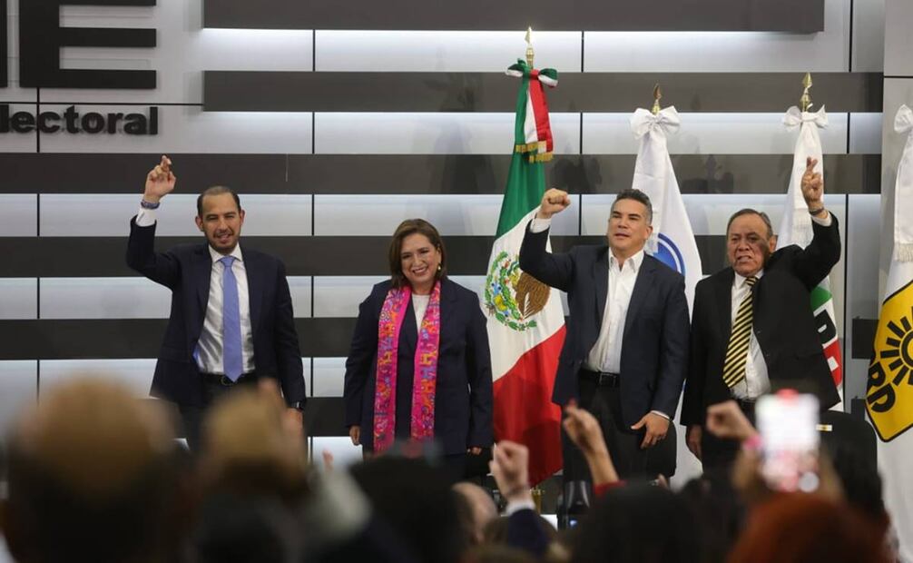 Acompañada de los líderes del PAN, PRI y PRD, Marko Cortés, Alejandro Moreno y Jesús Zambrano, respectivamente, la virtual candidata de la coalición Fuerza y Corazón por México fue recibida con aplausos y al grito de "¡Presidenta!".