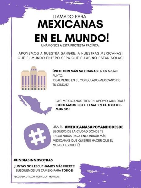 Now, Mexican women who live abroad are calling each other to join the protest by wearing purple clothes and protesting outside the Mexican consulates and embassies :